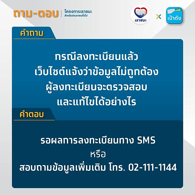 สำหรับผู้ที่ได้ เช็คสิทธิเราชนะ แล้วพบว่า ไม่ได้รับสิทธิ ในกรณี เช็คเราชนะ. ใครที่ได้รับข้อความว่า ลงทะเบียน เราชนะ ไม่สำเร็จ ทางกระทรวงการคลังชี้แจงว่า สามารถลงทะเบียนใหม่ซ้ำได้ แต่ต้องทำก่อนวันที่ 12 ก.พ.
